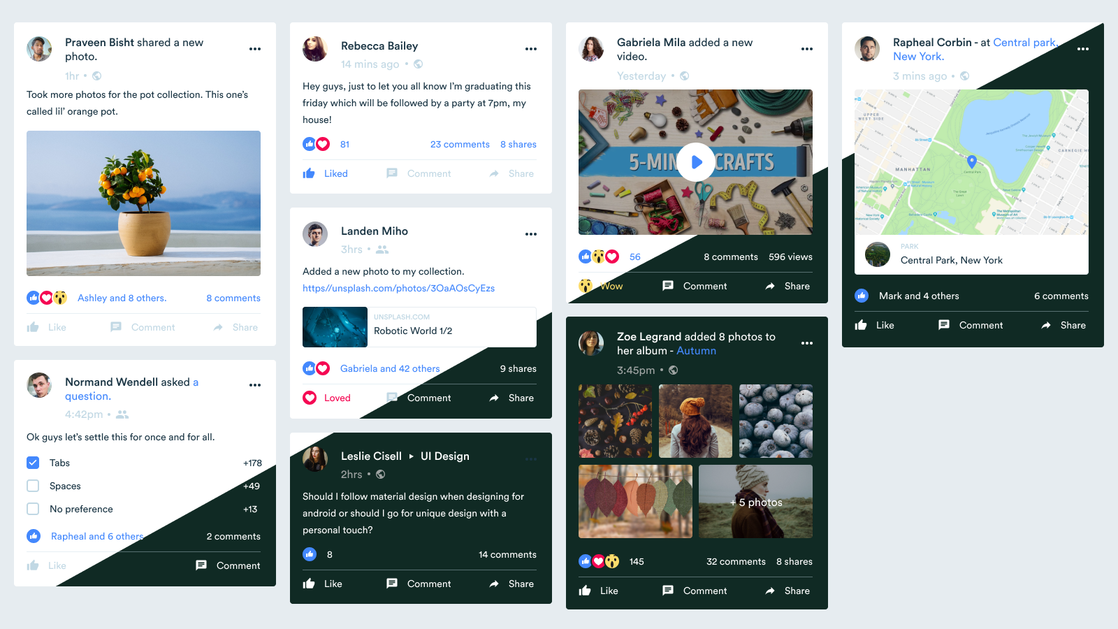 Explores concepts for feed, settings panel and various types of posts.